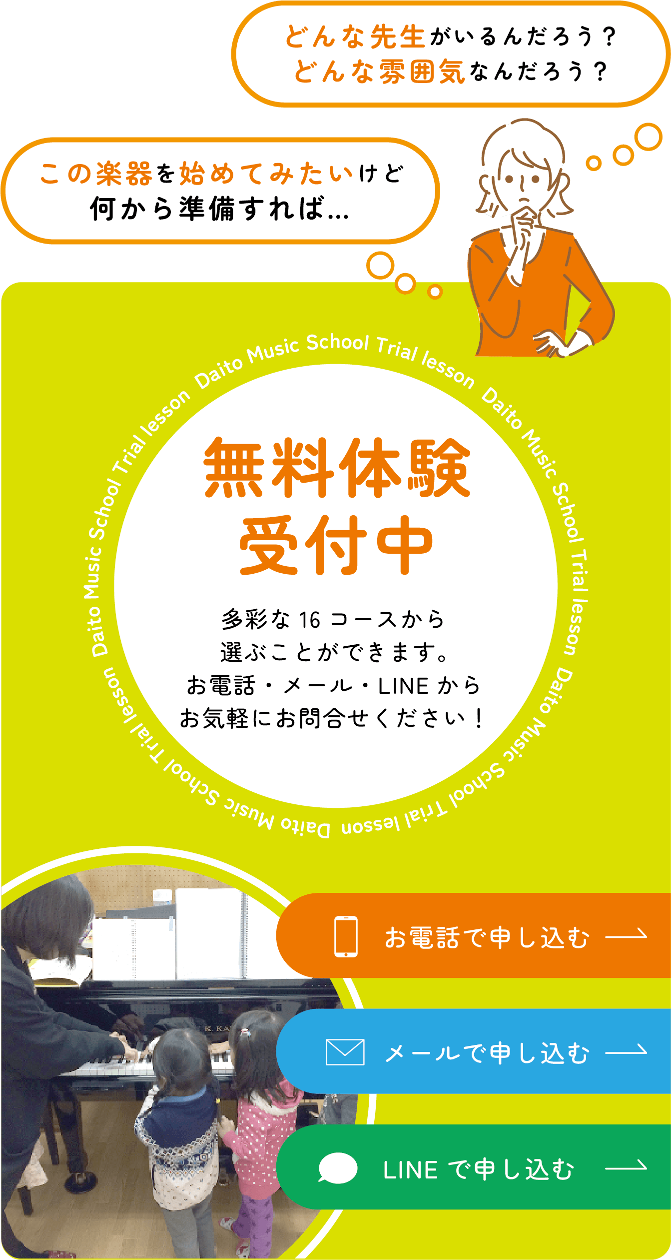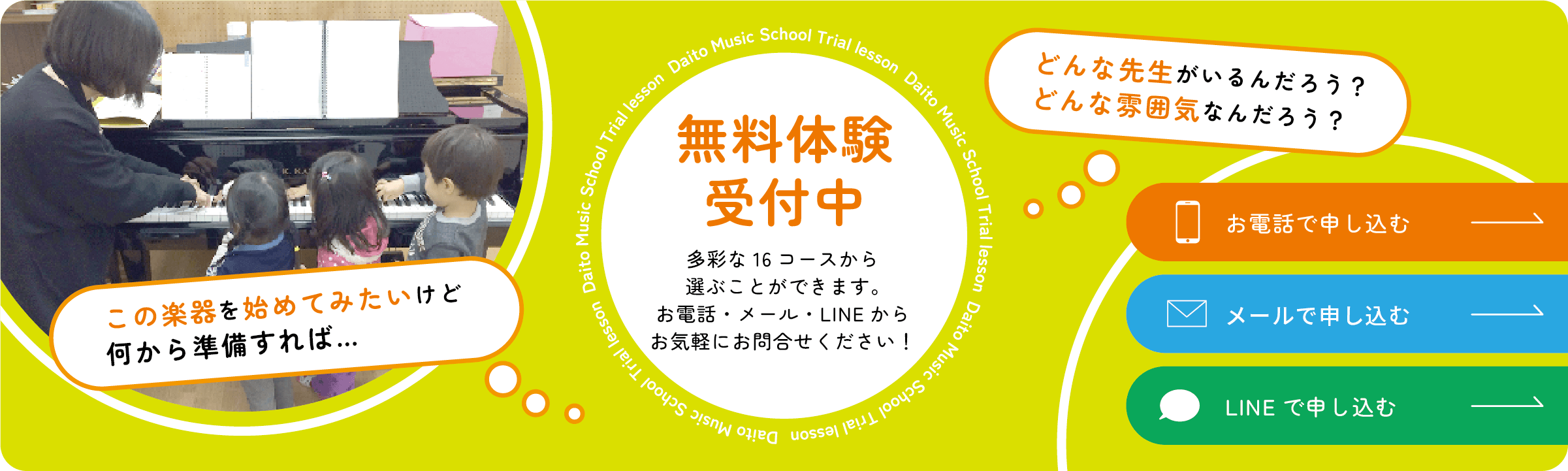 ダイトウ音楽院では無料体験レッスンを随時受け付けています。